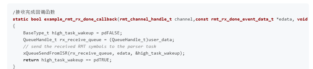 另外一个重要的点是设置RMT接收完成回调函数,当ESP32检测到RMT接收完成后,就会调用这个接收函数,通知我们数据接收完毕,我们看一下这个回调函数的实现。