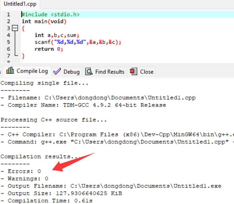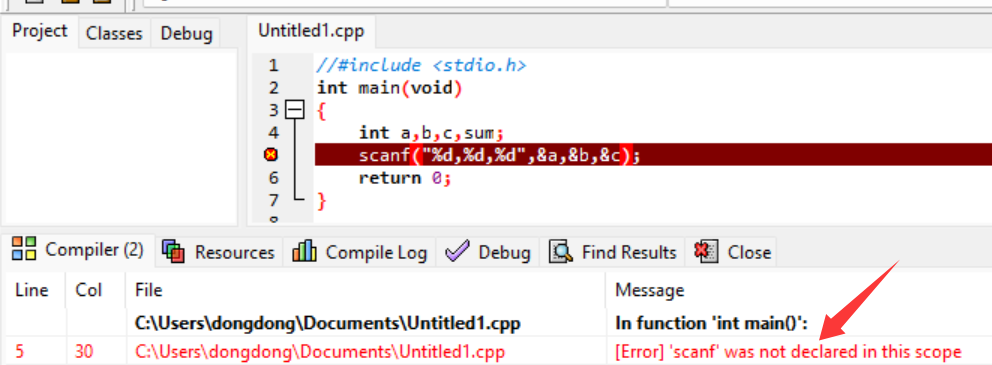 - scanf是stdio.h(standard input and output,基本输入输出)库中的函数,所以需要使用#include <stdio.h>将头文件包含进来,如过不包含,将提示scanf未定义。如下所示,我们将#include <stdio.h>注释掉,提示错误如下(scanf was not declared...)