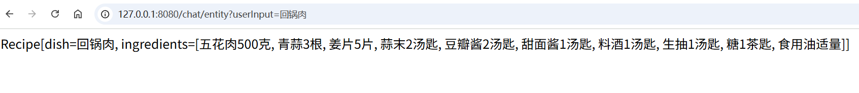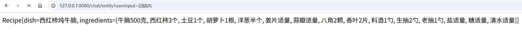 3. 测试:访问接口: http://127.0.0.1:8080/chat/entity?userInput=回锅肉
