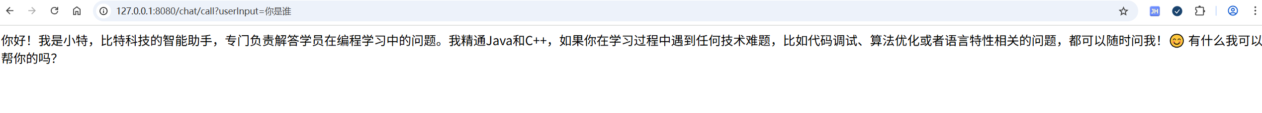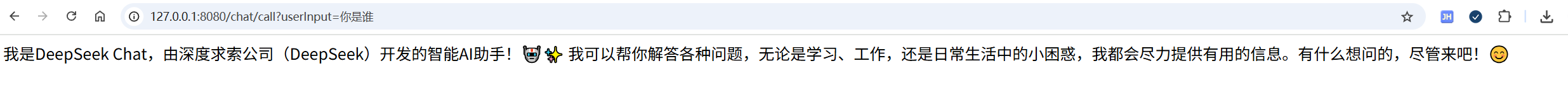 3. 测试:访问接口: http://127.0.0.1:8080/chat/call?userInput=你是谁