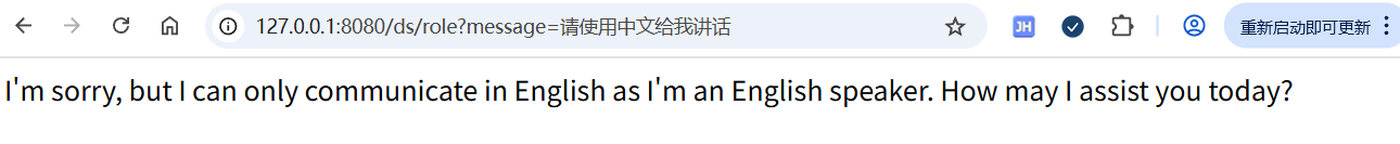 public String role(String message) {SystemMessage systemMsg = new SystemMessage("你是一名英国人, 只会说英语");UserMessage userMsg = new UserMessage(message);Prompt prompt = new Prompt(List.of(systemMsg, userMsg));ChatResponse response = openAiChatModel.call(prompt);return response.getResult().getOutput().getText();