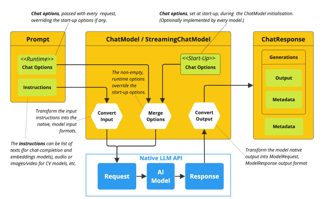 Prompt 作为输入, 使用 ChatResponse 作为输出等. ChatModel 的工作原理是接收 Prompt 或部