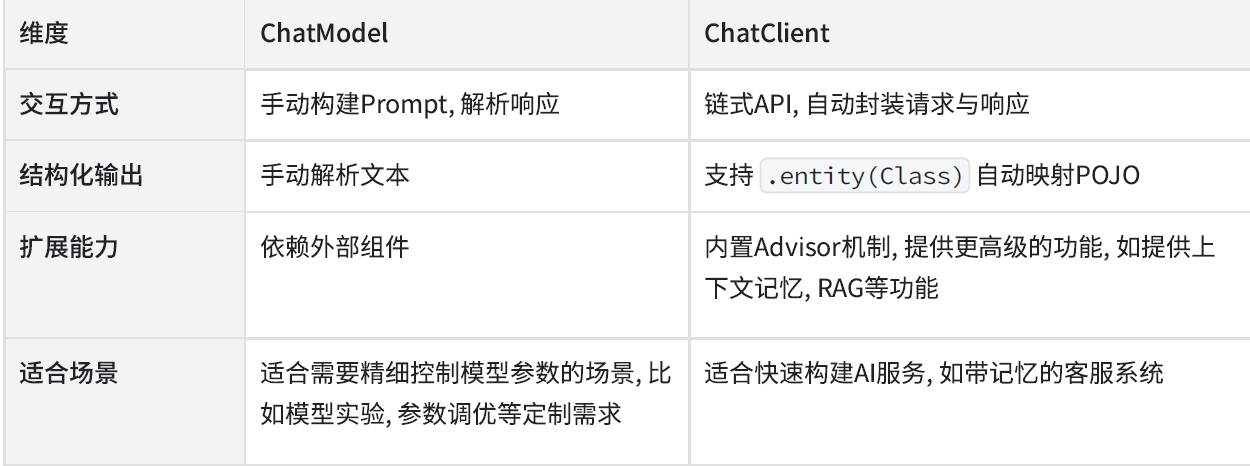 - ChatClient 对ChatModel进行了封装, 相比如ChatModel 原子类API,ChatClient屏蔽了与AI大模型的交互的复杂性, 它自动集成提示词管理、响应格式化、结构化输出映射等能力, 提高了开发效率.