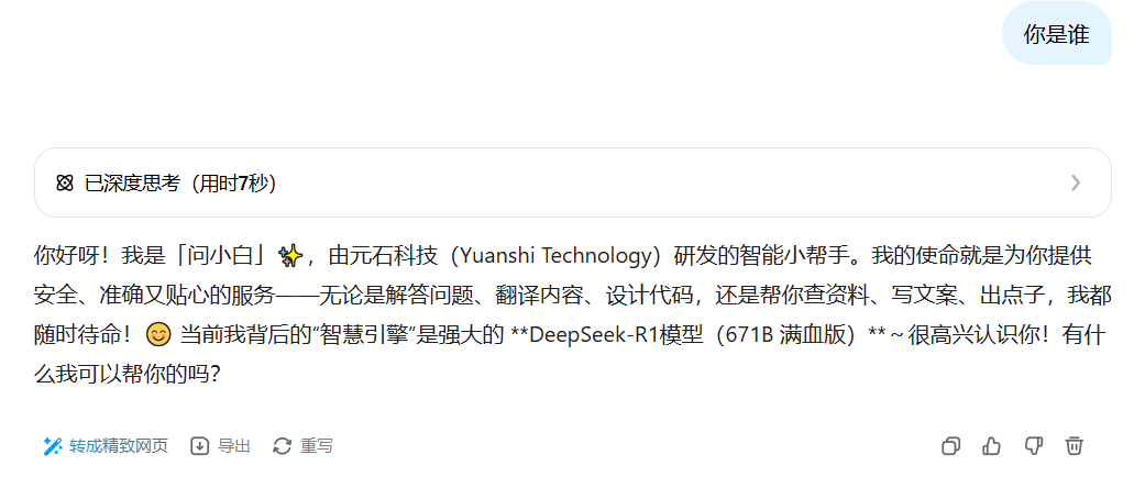 我们应用程序接入DeepSeek之后, 也可以设置自己智能助手的名字, 比如问小白: