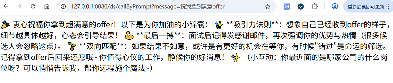 2. 测试:接口: http://127.0.0.1:8080/ds/callByPrompt?message=祝我拿到满意offer