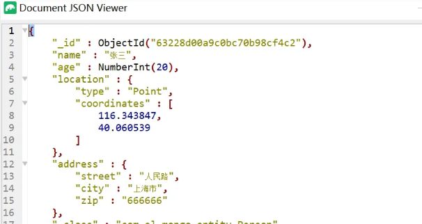 public class Person {@Id // 标识为主键private ObjectId id;@Indexed //标识索引字段private String name;private int age;/*** 用户位置* x: 经度,y:纬度*/@GeoSpatialIndexed(type = GeoSpatialIndexType.GEO_2DSPHERE)private GeoJsonPoint location;//存储嵌套对象数据private Address address;