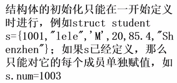 struct student s1,s2; //定义多个结构体变量int main(){// 初始化struct student s={1001,"zxy",'M',20,98};