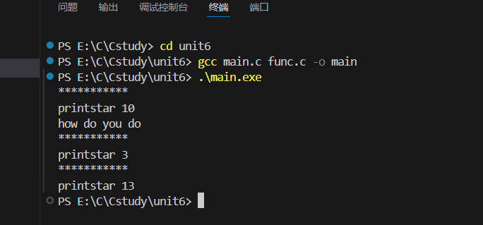 int main() {int a = 10;a = printstar(a); // 调用 printstar(10),返回 13print_message(); // 打印 how do you do,并调用 printstar(3)printstar(a); // 调用 printstar(13)return 0;