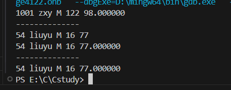 struct student s1,s2; //定义多个结构体变量int main(){// 初始化struct student s={1001,"zxy",'M',20,98};struct student sarr[3]; //定义一个结构体数组变量int i;//结构体输出必须单独取访问内部的每个成员s.age=122;printf("%d %s %c %d %f\n",s.num,s.name,s.sex,s.age,s.score);printf("--------------\n");scanf("%d %s %c %d %f",&s.num,s.name,&s.sex,&s.age,&s.score);printf("%d %s %c %d %f\n",s.num,s.name,s.sex,s.age,s.score); //读取内容后在输出printf("--------------\n");// 把 s 赋值到结构体数组 sarr[0]i=0;sarr[i]=s;// 输出数组中的第一个结构体printf("%d %s %c %d %f\n",sarr[i].num,sarr[i].name,sarr[i].sex,sarr[i].age,sarr[i].score);