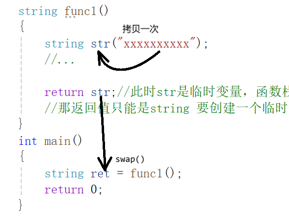 {string ret = func1();// ,//移动拷贝:直接将str与ret发生swap(),不仅得到str的值,而且还把ret的值了str(str反正要销毁)/*移动拷贝的实现:string中重载operator=(string&& s)string& operator=(string&& s){swap(s);return *this;}*///以前的operator=就像是只写了void func(int& r),无论是左值还是右值,都调用这个函数,//而现在如果是右值就会调用更适合的void func(int&& r)//回到string str ,str是函数的返回值是右值,自定义类型的右值就是将亡值, 那么有了operator=(string&& s)之后//会去调用operator=(string&& s),就直接将str与ret发生swap(),不仅得到str的值,而且还把ret的值了str(str反正要销毁)//这个过程叫移动拷贝//移动拷贝降低了原来的拷贝的次数return 0;