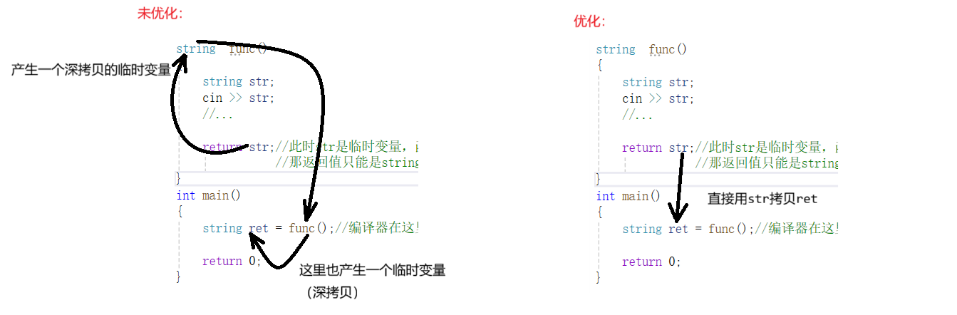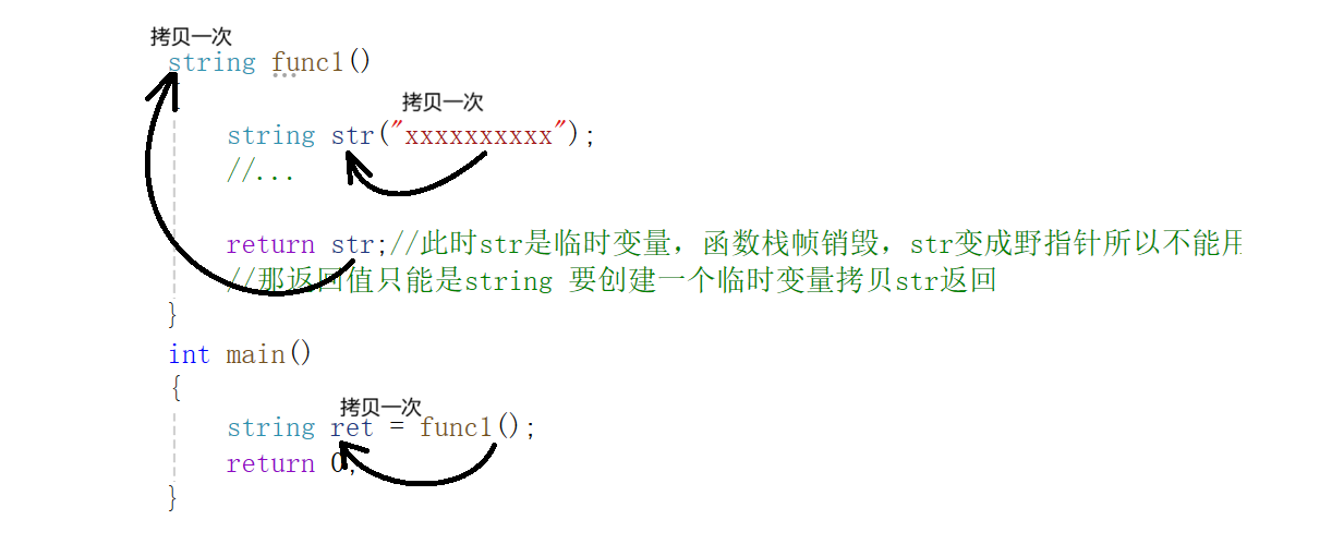 {string ret = func();//编译器在这里会优化,会在函数栈帧销毁前str变成野指针前,会直接用str去拷贝retreturn 0;