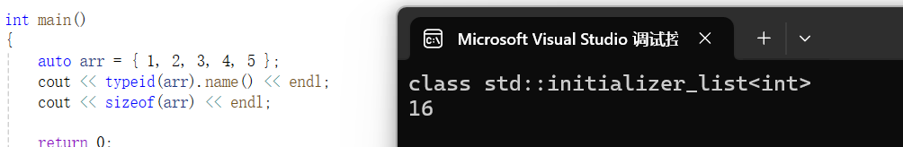 {auto arr = { 1, 2, 3, 4, 5 };cout << typeid(arr).name() << endl;cout << sizeof(arr) << endl;return 0;