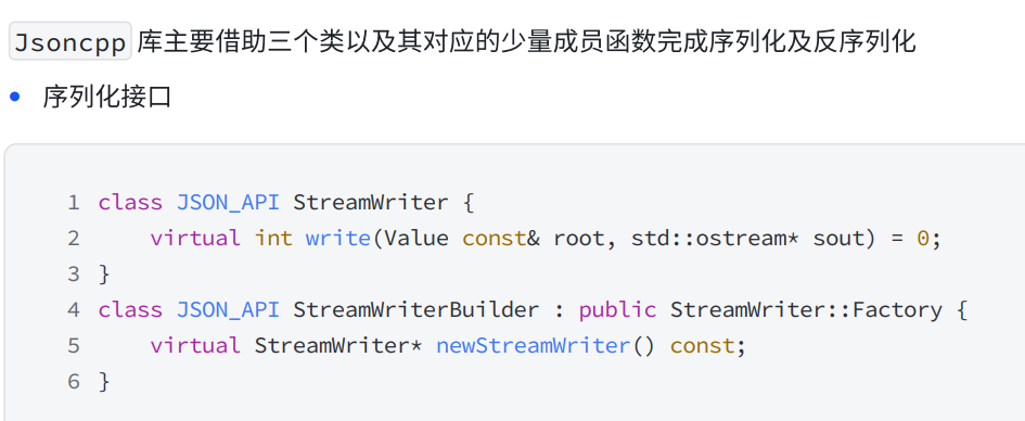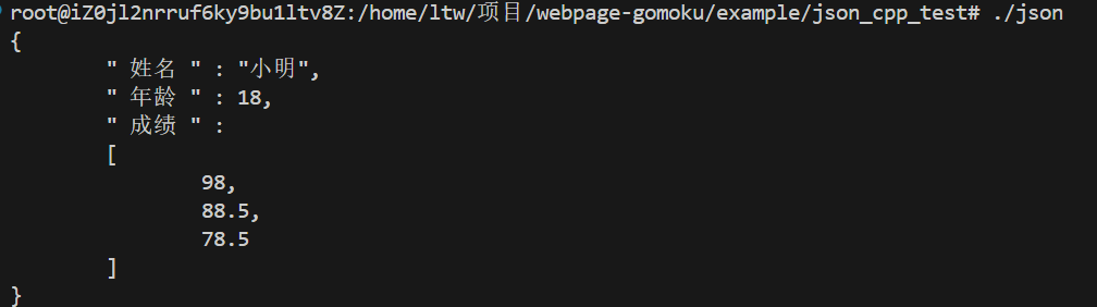 {//1. 将需要进行序列化的数据,存储在Json::Value对象中Json::Value root;root[" 姓名 "] = "小明";root[" 年龄 "] = 18;root[" 成绩 "].append(98);root[" 成绩 "].append(88.5);root[" 成绩 "].append(78.5);//2. 实例化一个StreamWriterBuilder工厂类对象Json::StreamWriterBuilder swb;//3. 通过StreamWriterBuilder工厂类对象生产一个StreamWriter对象Json::StreamWriter* sw = swb.newStreamWriter();//4. 使用StreamWriter对象,对Json::Value中存储的数据进行序列化std::stringstream ss;int ret = sw->write(root,&ss);if(ret != 0){std::cout << "json serialize failed!!!" << std::endl;return -1;}std::cout << ss.str() << std::endl;delete sw;return 0;