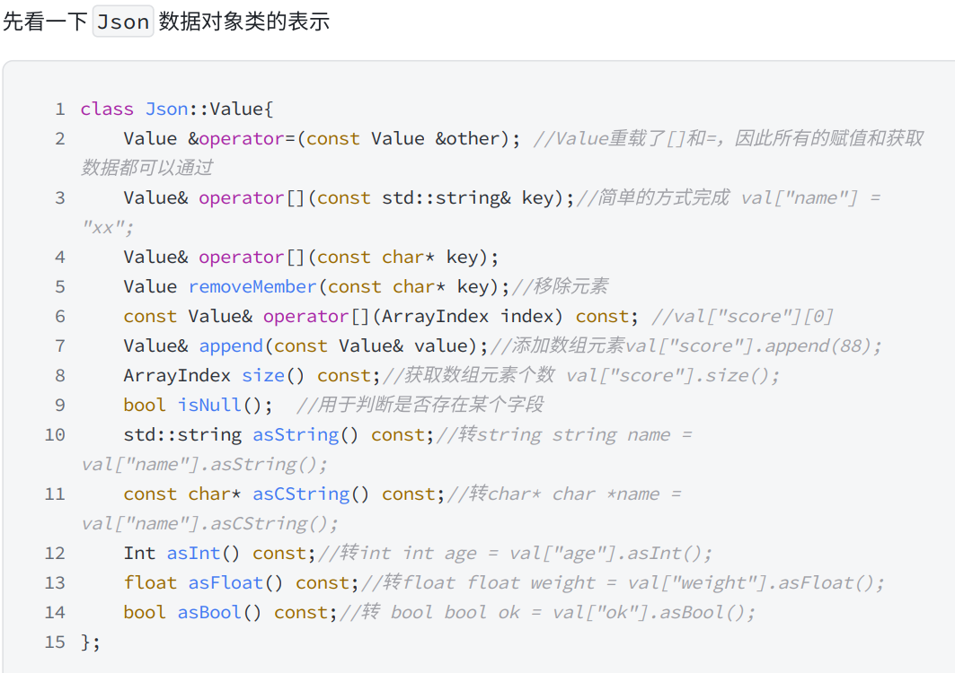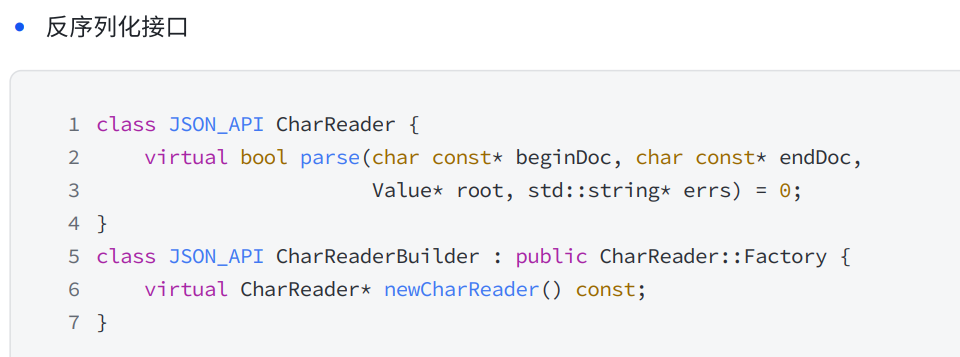 {//1.构建一个CharReaderBuilder工厂类Json::CharReaderBuilder crb;//2.使用CharReaderBuilder工厂类,生产出一个CharReader对象Json::CharReader *cr = crb.newCharReader();//3.定义一个Json::Value对象用于存储解析后的数据Json::Value root;std::string err;//4.使用CharReader对象进行Json格式字符串str的反序列化//parse(char* start,char* end,Json::Value* val,string* err);bool ret = cr->parse(str.c_str(),str.c_str() + str.size(),&root,&err);if(ret == false){std::cout << "json unserialize failed: " << err << std::endl;return;}//5.逐个元素去访问Json::Value中的数据std::cout << "姓名: " << root[" 姓名 "].asString() << std::endl;std::cout << "年龄: " << root[" 年龄 "].asInt() << std::endl;int sz = root[" 成绩 "].size();for(int i = 0;i < sz;i++){std::cout << "成绩: " << root[" 成绩 "][i].asFloat() << std::endl;}delete cr;