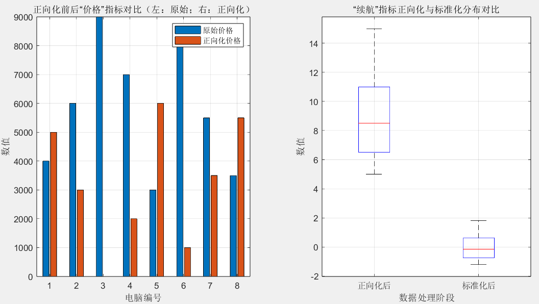 % 6. 自定义函数统一放在脚本结尾,代码无三目运算符,逻辑清晰可复用clear; clc; close all; % 初始化:清空工作区变量、命令行窗口、关闭所有图形窗口%% 1. 模块1:定义原始数据(8款电脑,30个指标)
