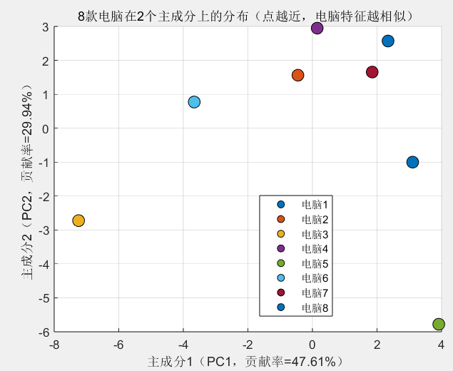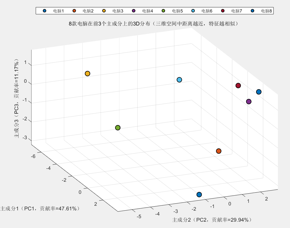 三个主成分从不同维度解构了 8 款电脑的核心差异: