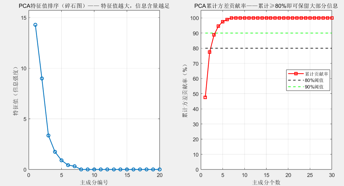 % 4. PCA核心计算:协方差矩阵、特征值/特征向量求解,按累计贡献率≥80%筛选主成分