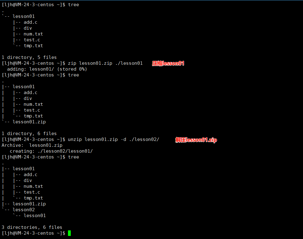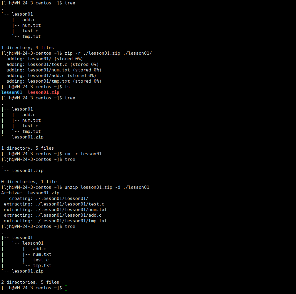 解释:先把lesson01压缩成了lesson01.zip,再解压lesson01.zip,发现解压后只有一个lesson01空目录,这是由于压缩dir目录时,没有使用-r递归处理,所以只有那个空目录被压缩。