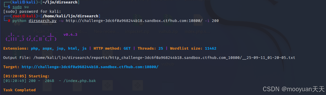 通过目录扫描工具对challenge-3dc6f0a968244b18.sandbox.ctfhub.com:10800进行渗透,这里选择使用dirsearch工具进行渗透,尝试发现隐藏文件或目录,并通过 -i 200