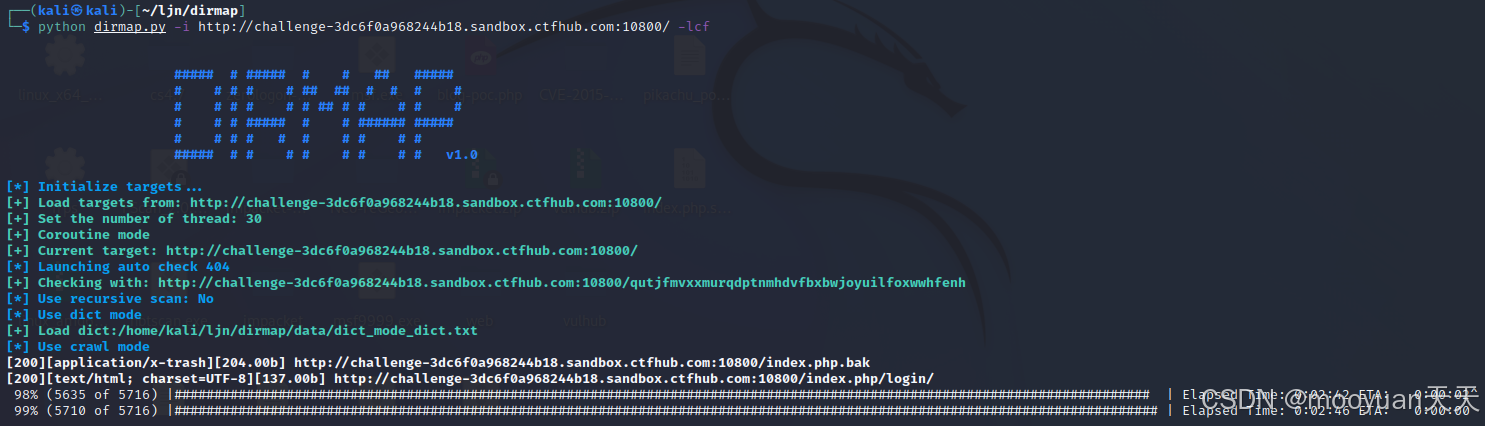 python dirmap.py -i http://challenge-3dc6f0a968244b18.sandbox.ctfhub.com:10800/ -lcf