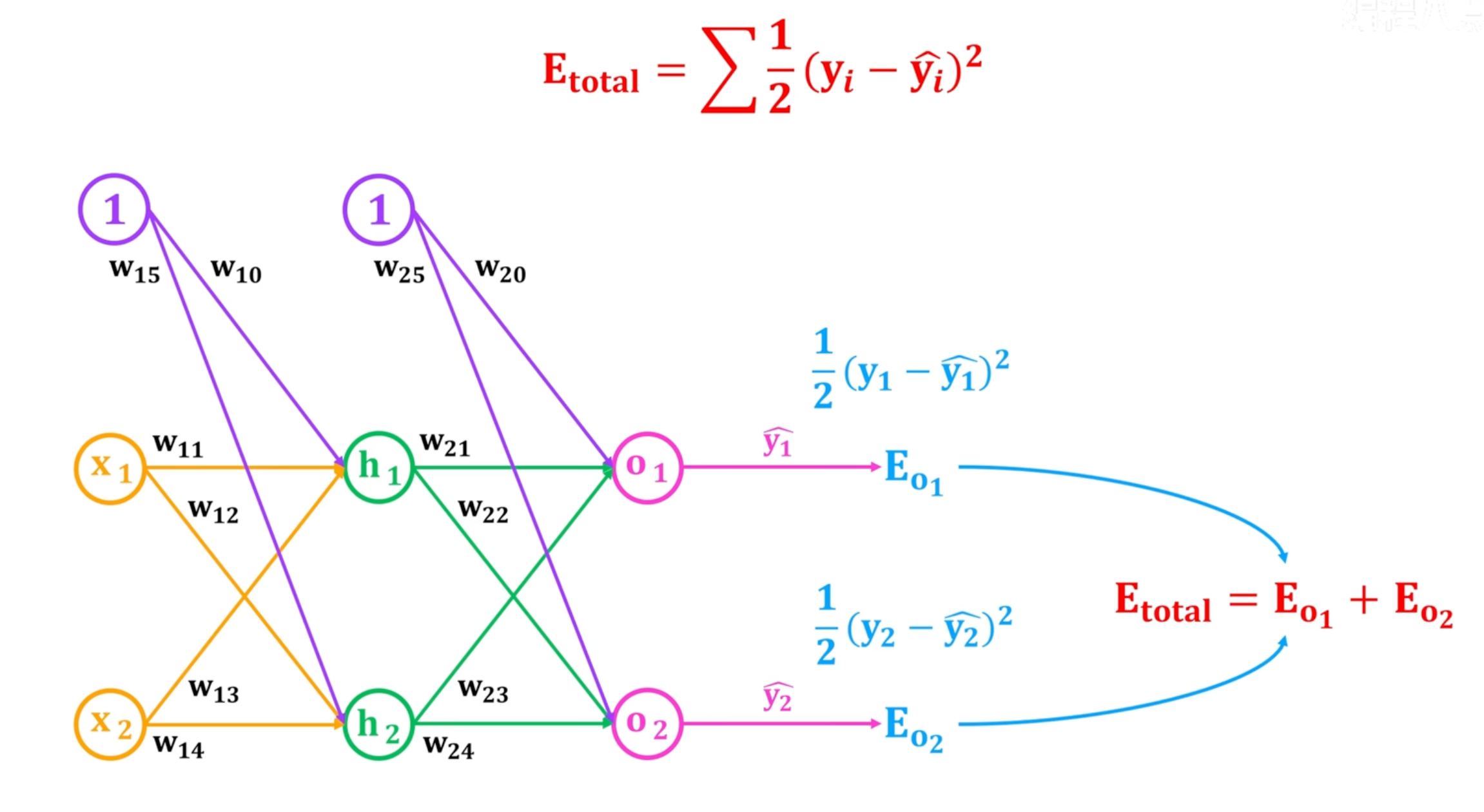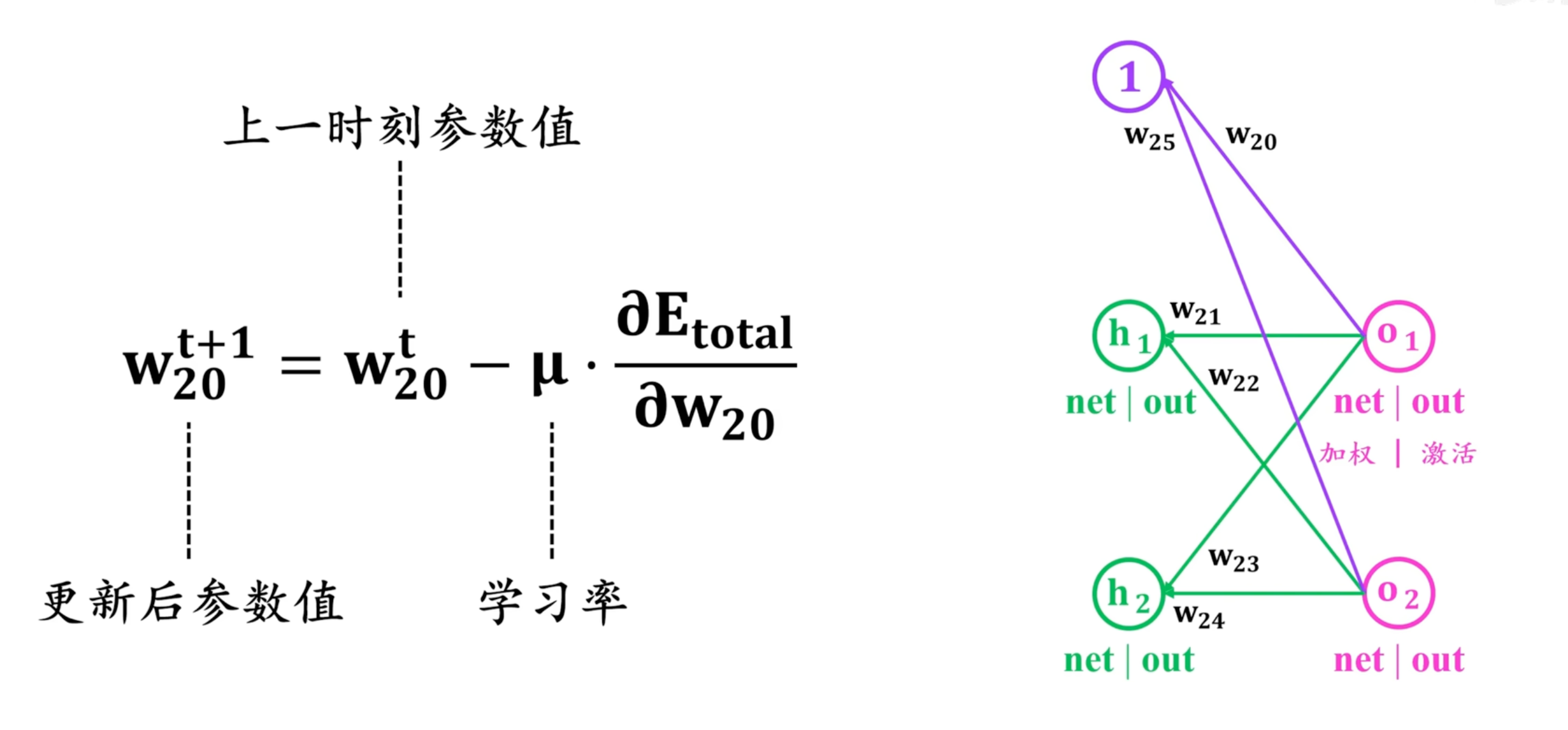 更新w20参数,利用梯度下降法。同理可更新其他参数,注意如w11这层的参数更新需要考虑到Eo1和Eo2的反向传递