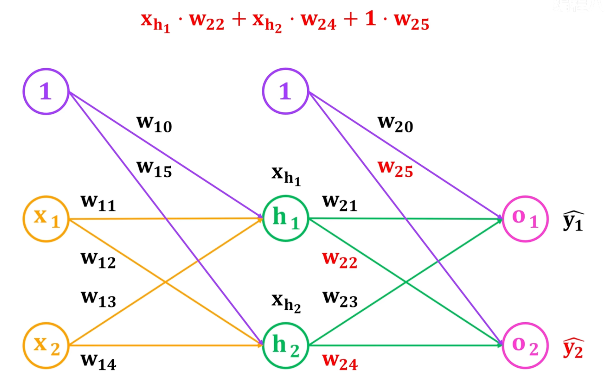 本文举例的神经网络为:隐藏层为h,有2个神经单元,1表示偏置,