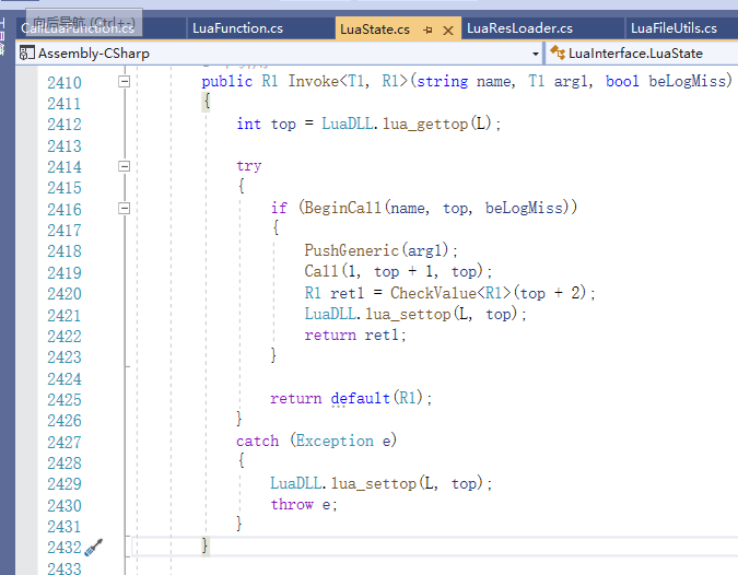 LuaState lua = new LuaState();lua.Start();LuaFunction luaFunc = lua.GetFunction("test.luaFunc");//style1int num = luaFunc.Invoke<int, int>(123456);Debugger.Log("generic call return: {0}", num);//style2num = CallFunc();Debugger.Log("expansion call return: {0}", num);//style3Func<int, int> Func = luaFunc.ToDelegate<Func<int, int>>();num = Func(123456);Debugger.Log("Delegate call return: {0}", num);//style4num = lua.Invoke<int, int>("test.luaFunc", 123456, true);Debugger.Log("luastate call return: {0}", num);int CallFunc(){ luaFunc.BeginPCall(); luaFunc.Push(123456);luaFunc.PCall(); int num = (int)luaFunc.CheckNumber();luaFunc.EndPCall();return num; }