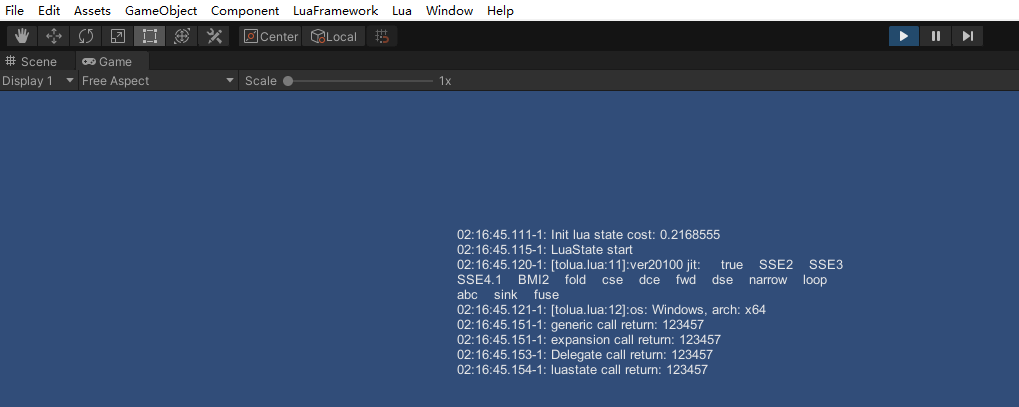 #endifnew LuaResLoader();lua = new LuaState();lua.Start();DelegateFactory.Init(); lua.DoString(script);//Get the function objectluaFunc = lua.GetFunction("test.luaFunc");if (luaFunc != null){int num = luaFunc.Invoke<int, int>(123456);Debugger.Log("generic call return: {0}", num);num = CallFunc();Debugger.Log("expansion call return: {0}", num);Func<int, int> Func = luaFunc.ToDelegate<Func<int, int>>();num = Func(123456);Debugger.Log("Delegate call return: {0}", num);num = lua.Invoke<int, int>("test.luaFunc", 123456, true);Debugger.Log("luastate call return: {0}", num);}lua.CheckTop();}void ShowTips(string msg, string stackTrace, LogType type){tips += msg;tips += "\r\n";}#if !TEST_GCvoid OnGUI(){GUI.Label(new Rect(Screen.width / 2 - 200, Screen.height / 2 - 150, 400, 300), tips);}