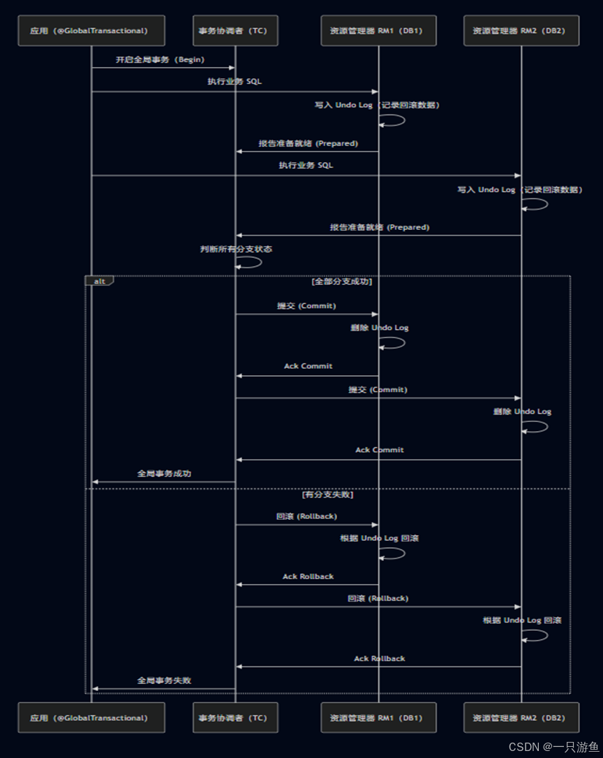 - RM(资源管理器,比如某个微服务/数据库)执行 SQL 时,会生成 undo log(回滚数据)