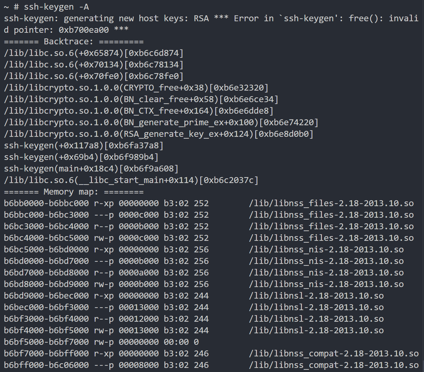 如果你在单板上运行 ssh-keygen 的时候程序崩溃了并出现了以下信息: