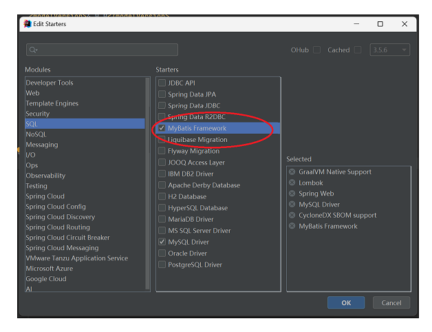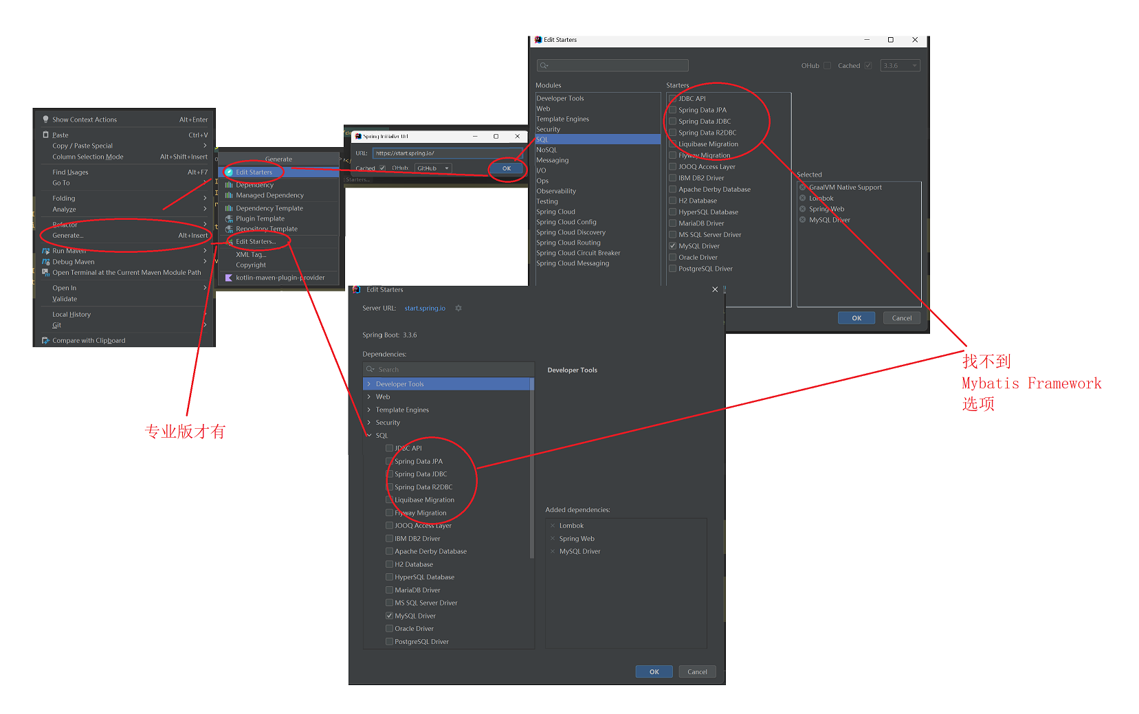 在创建项目时和EditStarts引入Mybatis Framework的依赖时,结果找不到,前者请在创建项目页面选择更高Spring版本;后者情况如图: