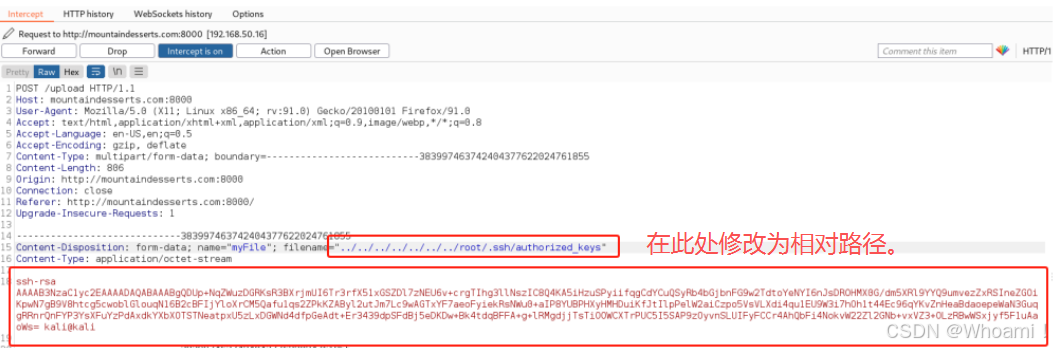 关键操作:使用相对路径上传它../../../../../../../root/.ssh/authorized_keys。