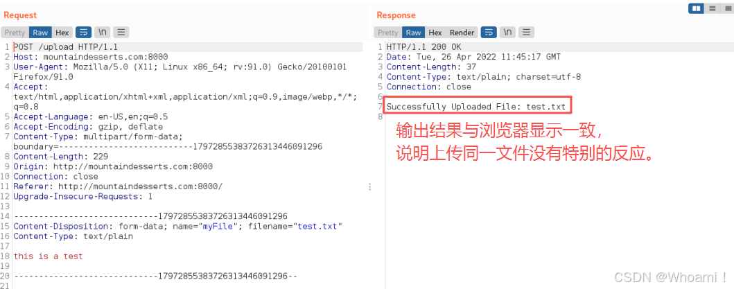 让我们在 Burp 中查看test.txt上传请求。在HTTP历史记录中选择POST请求,将其发送到Repeater,并点击发送,这是第二次上传同一个文件。