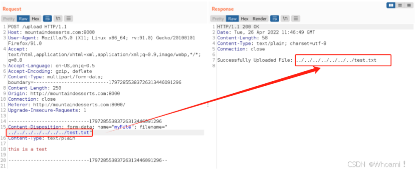 如下图:通过修改请求中的“filename”参数,使用../../../../../../../test.txt相对路径,然后点击发送。