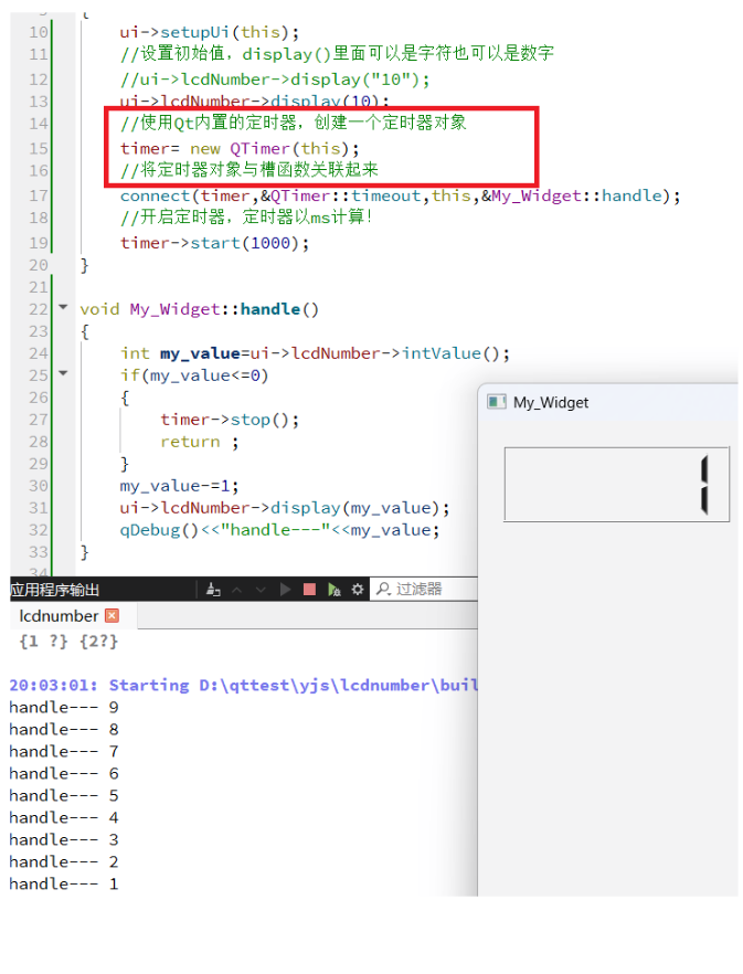{ui->setupUi(this);//设置初始值ui->lcdNumber->display(10);int my_value=ui->lcdNumber->intValue();while(true){//使用C++线程库中的sleep_for函数//std::chrono::seconds:按秒进行休眠!std::this_thread::sleep_for(std::chrono::seconds(1));if(my_value<=0){break;}my_value-=1;ui->lcdNumber->display(my_value);}