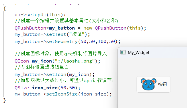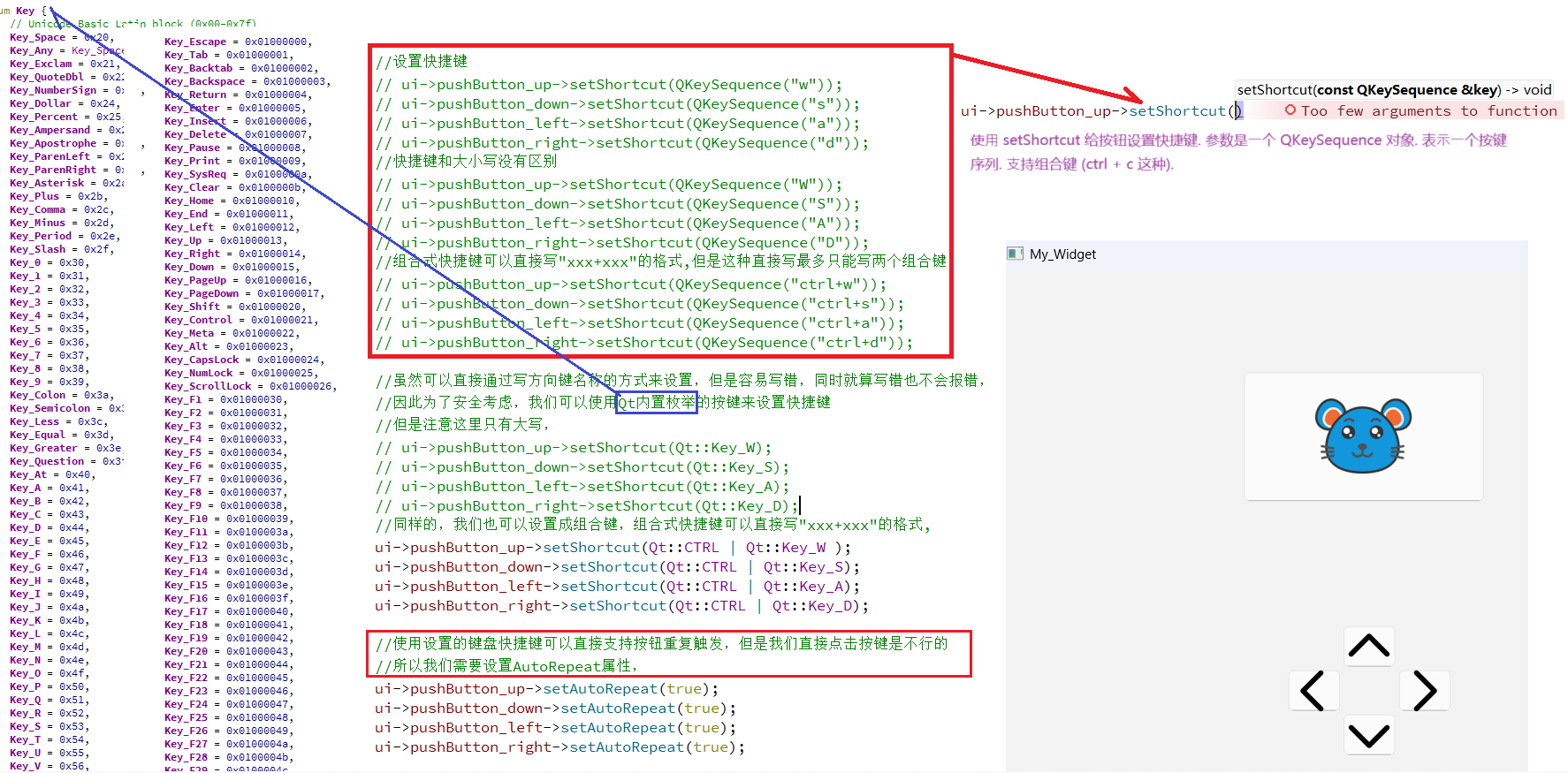 {ui->setupUi(this);//设置按钮图标ui->pushButton_target->setIcon(QIcon(":/my_image/laoshu.png"));ui->pushButton_target->setIconSize(QSize(100,100));ui->pushButton_up->setIcon(QIcon(":/my_image/up.png"));ui->pushButton_up->setIconSize(QSize(40,40));ui->pushButton_down->setIcon(QIcon(":/my_image/down.png"));ui->pushButton_down->setIconSize(QSize(40,40));ui->pushButton_left->setIcon(QIcon(":/my_image/left.png"));ui->pushButton_left->setIconSize(QSize(40,40));ui->pushButton_right->setIcon(QIcon(":/my_image/right.png"));ui->pushButton_right->setIconSize(QSize(40,40));//设置快捷键// ui->pushButton_up->setShortcut(QKeySequence("w"));// ui->pushButton_down->setShortcut(QKeySequence("s"));// ui->pushButton_left->setShortcut(QKeySequence("a"));// ui->pushButton_right->setShortcut(QKeySequence("d"));//快捷键和大小写没有区别// ui->pushButton_up->setShortcut(QKeySequence("W"));// ui->pushButton_down->setShortcut(QKeySequence("S"));// ui->pushButton_left->setShortcut(QKeySequence("A"));// ui->pushButton_right->setShortcut(QKeySequence("D"));//组合式快捷键可以直接写"xxx+xxx"的格式,但是这种直接写最多只能写两个组合键// ui->pushButton_up->setShortcut(QKeySequence("ctrl+w"));// ui->pushButton_down->setShortcut(QKeySequence("ctrl+s"));// ui->pushButton_left->setShortcut(QKeySequence("ctrl+a"));// ui->pushButton_right->setShortcut(QKeySequence("ctrl+d"));//虽然可以直接通过写方向键名称的方式来设置,但是容易写错,同时就算写错也不会报错,//因此为了安全考虑,我们可以使用Qt内置枚举的按键来设置快捷键//但是注意这里只有大写,// ui->pushButton_up->setShortcut(Qt::Key_W);// ui->pushButton_down->setShortcut(Qt::Key_S);// ui->pushButton_left->setShortcut(Qt::Key_A);// ui->pushButton_right->setShortcut(Qt::Key_D);//同样的,我们也可以设置成组合键,组合式快捷键可以直接写"xxx+xxx"的格式,ui->pushButton_up->setShortcut(Qt::CTRL | Qt::Key_W );ui->pushButton_down->setShortcut(Qt::CTRL | Qt::Key_S);ui->pushButton_left->setShortcut(Qt::CTRL | Qt::Key_A);ui->pushButton_right->setShortcut(Qt::CTRL | Qt::Key_D);//使用设置的键盘快捷键可以直接支持按钮重复触发,但是我们直接点击按键是不行的//所以我们需要设置AutoRepeat属性,ui->pushButton_up->setAutoRepeat(true);ui->pushButton_down->setAutoRepeat(true);ui->pushButton_left->setAutoRepeat(true);ui->pushButton_right->setAutoRepeat(true);