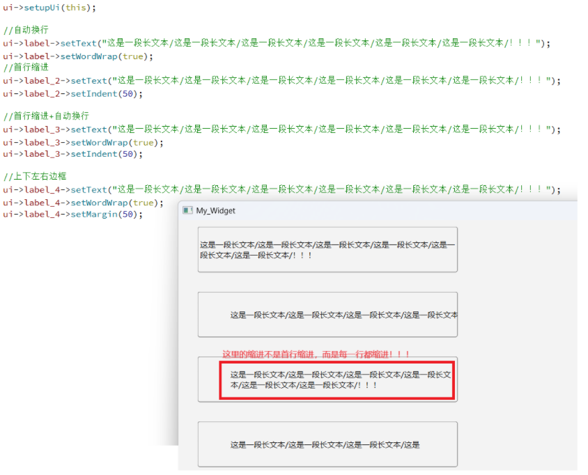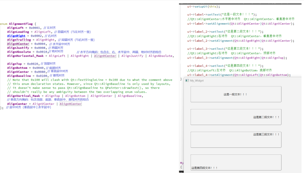 可以看到,在 Qt 中,各种对齐方式已经用枚举列出来了。当我们需要设置对齐方式时,只需通过 Alignment()来设置就行。至于QLabel 中的自动换行、缩进、边距这些,只需要通过API设置即可,具体如下所示: