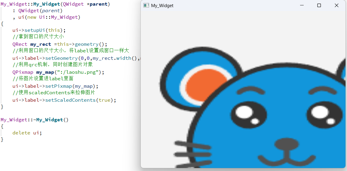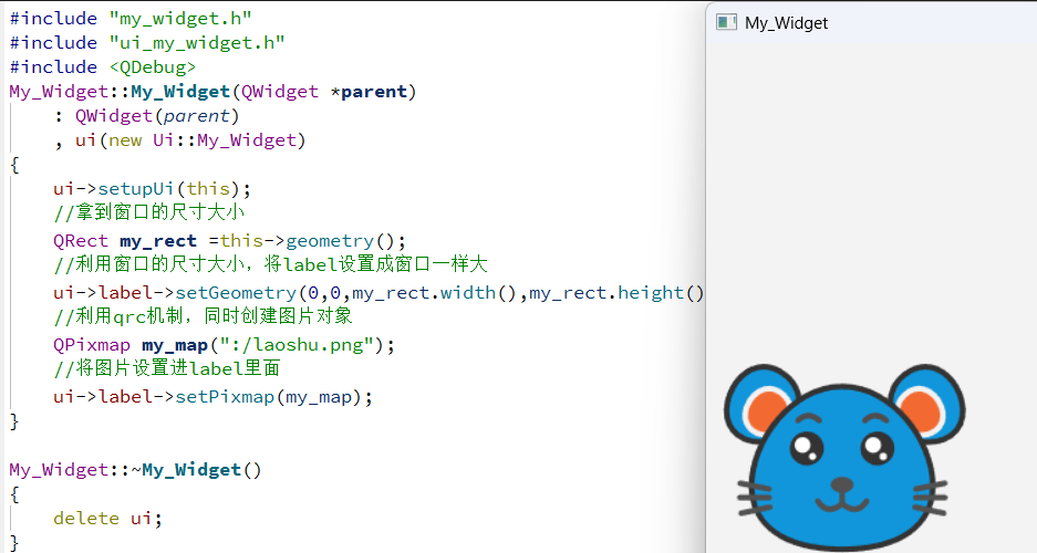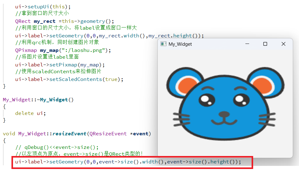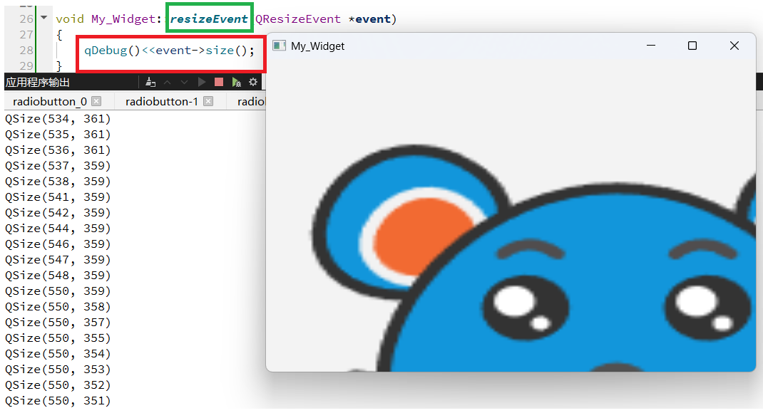 由上可知,当我们在窗口类 Widget 里重写了 resizeEvent 函数后,通过 qDebug 打印的内容可以发现,窗口大小会跟着我们的拖拽实时变化。这样一来,我们只需要在这个重写的虚函数里面,设置图片的尺寸大小就行了,具体做法如下所示:
