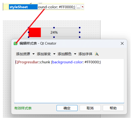 别忘了,QProgressBar 同样是 QWidget 的子类,因此我们可以利用 styleSheet 属性通过样式表修改进度条的颜色。只需在 Qt Designer 右侧的属性编辑器中,找到 QWidget 的 styleSheet 属性,打开样式表并写入 QProgressBar::chunk {background-color: #FF0000/black;},其中 chunk 指的是进度条中选中的每个 “块”。若要选中文本,可使用 QProgressBar::text;同时需将 QProgressBar 的 alignment 属性设置为垂直水平居中,因为若不设置该属性,进度条中的数字会跑到左上角。这一点怀疑是 Qt 自身的 bug,目前暂时只能通过 alignment 手动调整。通过上述方式,我们也能依样修改文字的颜色、字体大小等样式。