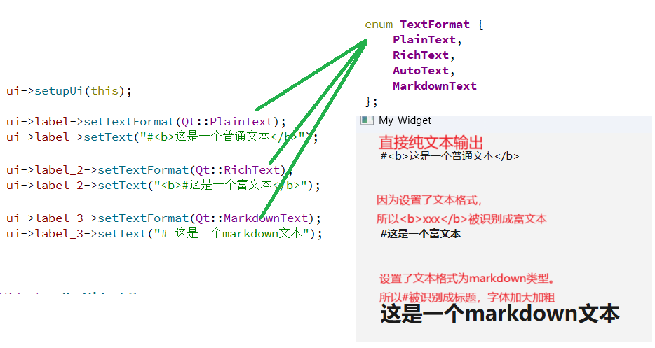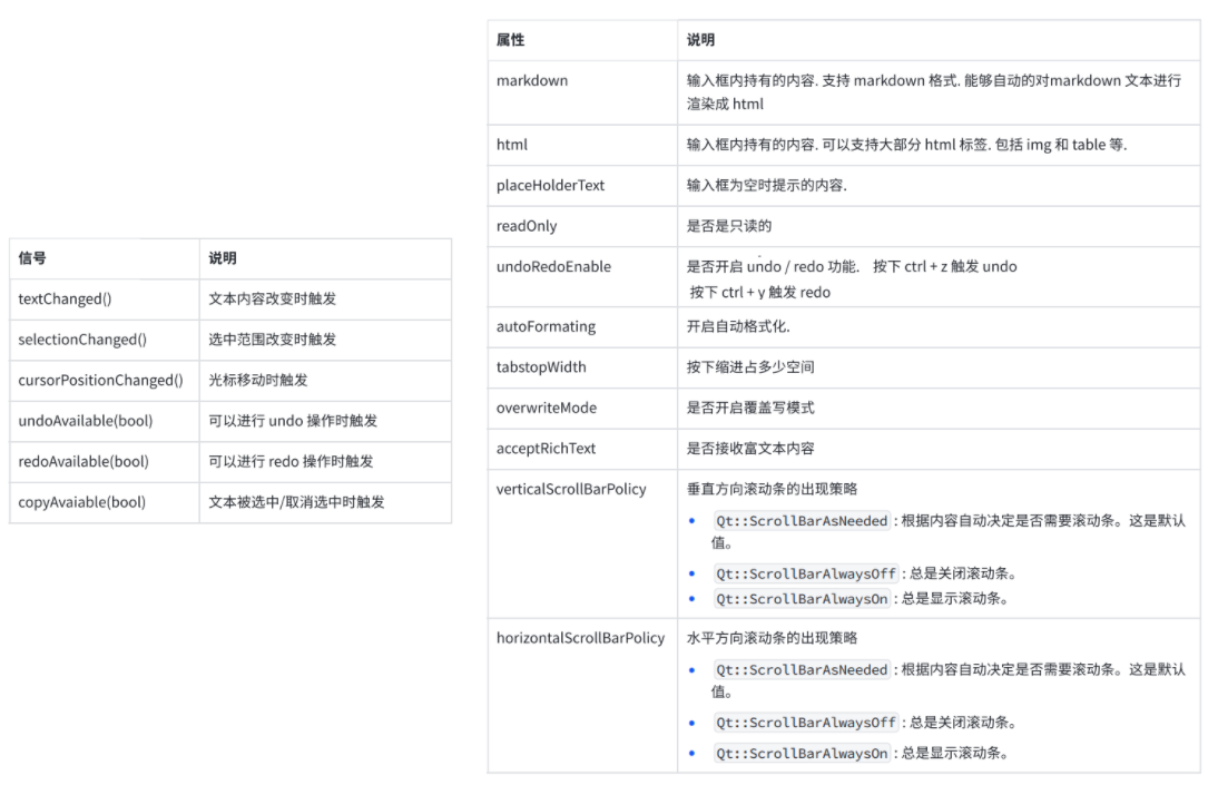 则还支持 HTML 和 Markdown 格式的文本!至于其他属性大致相同,因此此处我们就以QTextEdit