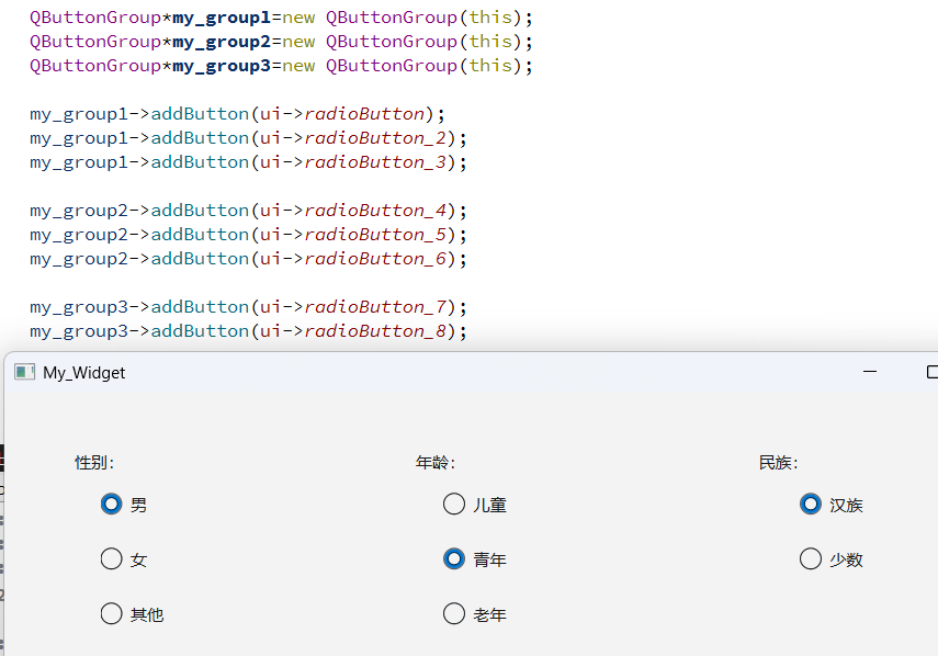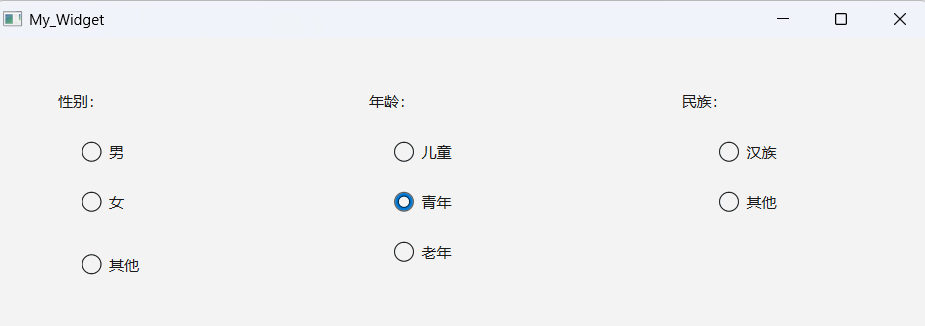通过这样的分组,利用QButtonGroup就可以让不同类别的单选按钮各自独立互斥,比如选 “性别” 里的 “男”,不影响 “年龄” 里选 “青年”、“民族” 里选 “汉族”。