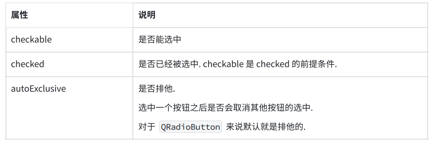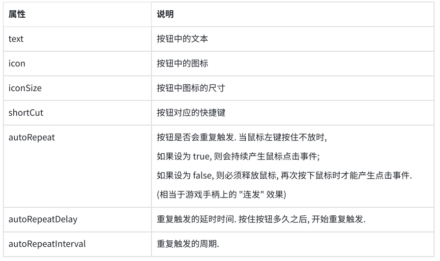 作为 QWidget 的子类,QAbstractButton 自然也继承了 QWidget 的所有属性。我之前的博客介绍过的QWidget 的各种常用控件属性的用法,在QAbstractButton 中同样适用。因此上面的表格仅列出 QAbstractButton 特有的属性。