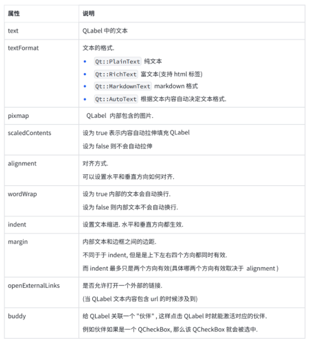 QLabel 通常不直接用户直接交互,主要起展示信息的作用,常配合输入框、按钮等控件使用,比如在输入框前显示 “用户名:” 这样的提示文字,让界面更易理解。下面给出Qlabel常用的api,具体如下所示: