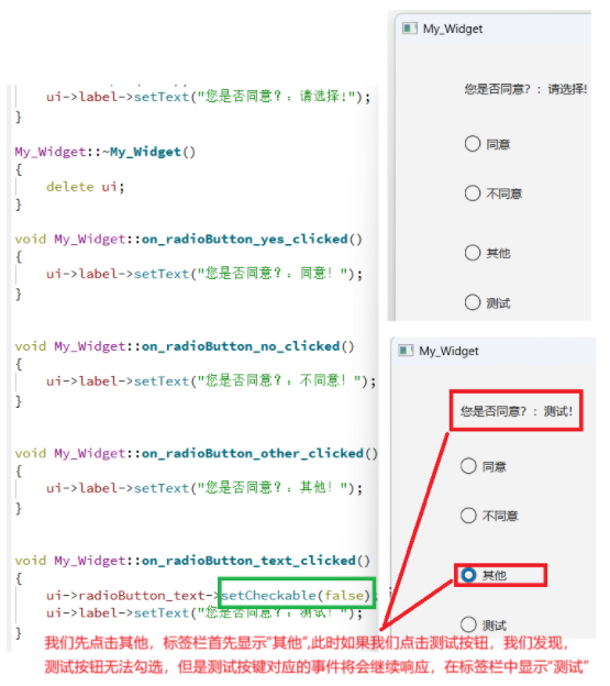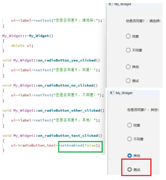 运行程序后能看到,通过设置 checkable (),点击 "测试" 按钮时,它虽然不会被选中,却能触发点击事件,让上面的 label 显示 "测试"。要是想“禁用”这个按钮,除了不让它被选中,还能利用 QWidget 里的 enabled () 属性,彻底把 "测试" 按钮禁用掉,具体做法如下: