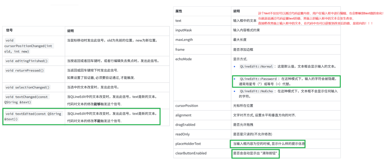 不同于显示类控件,输入类控件既能展示内容,也能让用户输入信息。在众多输入类控件里,我们使用最频繁的便是 QLineEdit。它是基础且常用的单行文本输入控件,主要用于接收用户的单行文本输入(如账号、密码、搜索关键词等),但输入时不支持换行,同时具备文本编辑、格式限制、输入校验等功能,是界面交互中必不可少的组件。下面提供Line Edit相关的 API,具体内容如下所示: