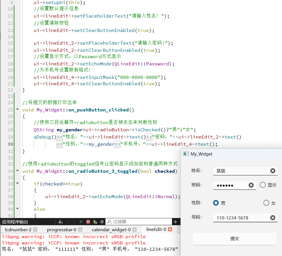 {ui->setupUi(this);ui->lineEdit->setEchoMode(QLineEdit::Password);ui->lineEdit->setClearButtonEnabled(true);ui->lineEdit_2->setEchoMode(QLineEdit::Password);ui->lineEdit_2->setClearButtonEnabled(true);