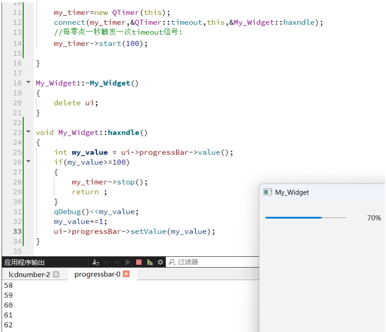 由于前面已介绍过 Qt 禁止在其他线程中修改界面,所以进度条的更新往往也需要配合定时器来实现。通过定时器周期性地触发信号,主线程会调用对应的 slot 函数,再在 slot 函数中计算当前的任务进度,并更新进度条的界面显示效果。