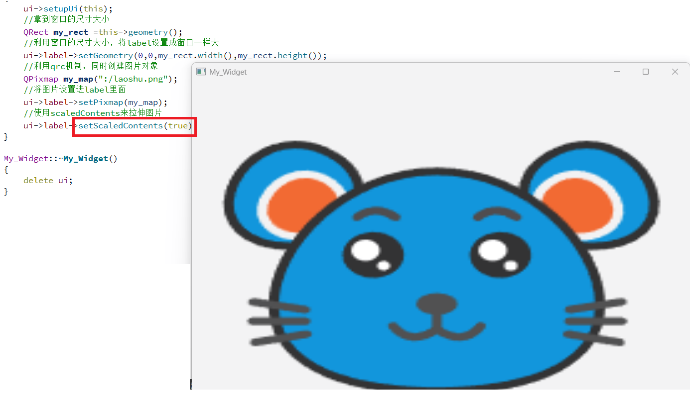通过上述示例能看到,我们用 pixmap () 可以给 QLabel 设置图片,但图片的尺寸好像不是我们想要的 —— 这主要是因为图片本身的大小有限制。现在导入的这张图片太小了,填不满整个窗口,所以为了让图片能铺满整个窗口或者 QLabel,我们得用 scaledContents () 这个接口,把图片拉伸一下,具体做法如下所示: