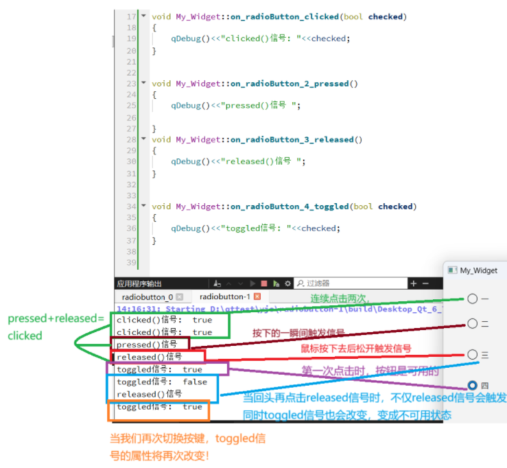 QRadioButton 是单选按钮. 可以让我们在多个选项中选择⼀个.,继承自 QAbstractButton 和 QWidget,完整继承了两者的属性与功能。它继承 QAbstractButton 的状态切换、事件响应等特性,支持 setText ()、setChecked () 等方法;作为 QWidget 子类,支持用户与GUI界面交互控制等。其核心是单选机制。所以在使用中,我们还是比较关心QAbstractButton 中和 QRadioButton 关系较⼤的属性,如下所示: