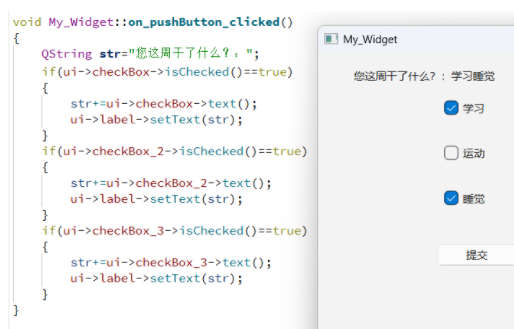 前面我们已经了解了单选按钮(RadioButton),接下来看看多选按钮(QCheckBox)。QCheckBox 是复选按钮,允许同时选中多个选项。和 QCheckBox 关系最密切的属性也是 checkable 和 checked,这两个都是从 QAbstractButton 继承来的。至于 QCheckBox 特有的 tristate 属性,它是用来实现 "三态复选框" 的。这个功能比较冷门,我们暂时先不讨论。下面给出一个示例,来看看如何使用复选按钮,具体如下所示: